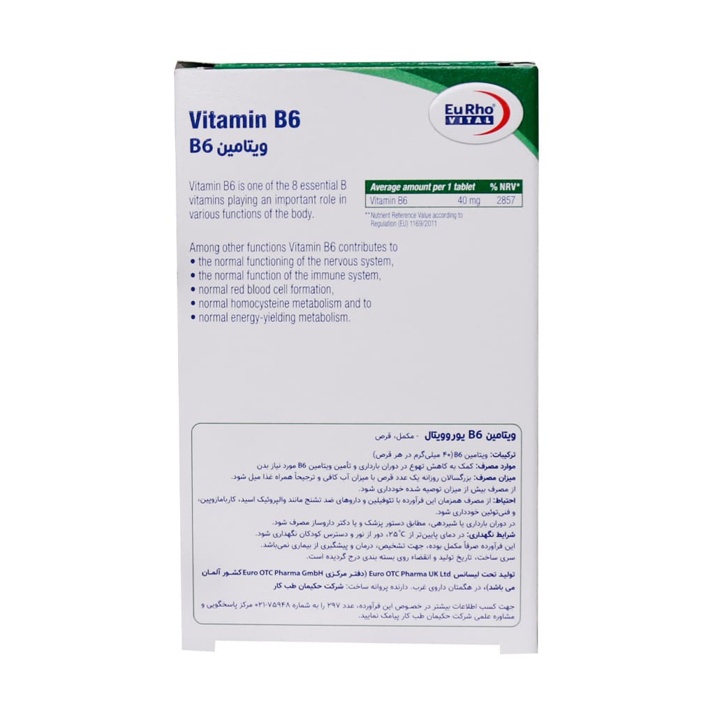 قرص ویتامین B6 یوروویتال جهت تقویت سیستم عصبی، ساخت گلبولهای قرمز و آزادسازی انرژی مناسب است. در هر قرص حدود 40 میلی گرم ویتامین B6 وجود دارد که این قرصها به صورت روزانه قابل استفاده هستند.